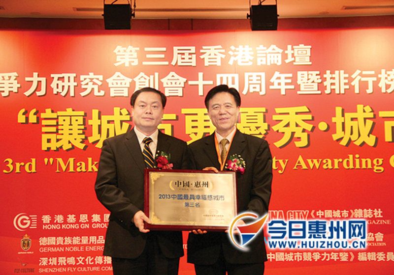 2013年12月10日,惠州市获颁“2013中国最具幸福感城市”、“2013中国十佳宜居城市”、“2013中国十佳空气质量城市”牌匾。当日,由中国城市竞争力研究会主办的第三届“香港论坛 中国城市新动力·新价值”暨第三届“让城市更优秀·城市颁奖礼”活动在香港会展中心先后举行。中央人民政府驻香港特别行政区联络办公室宣传文体部副部长刘汉祺;市委副书记、市长麦教猛,市委常委、宣传部长黄雁行;中国城市竞争力研究会会长桂强芳等出席活动。