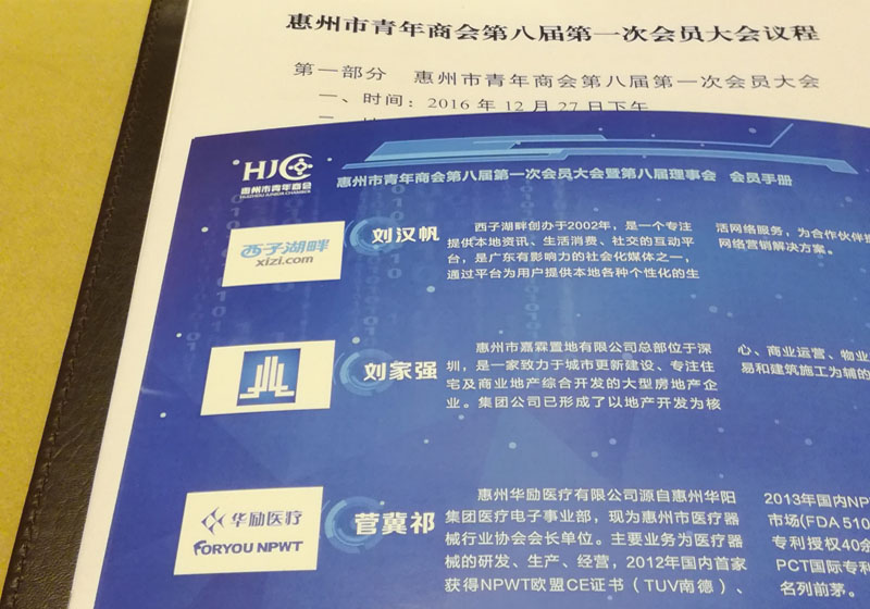 2016年12月27日(星期二)下午15:00至21:00,惠州青年商会第八次会员大会、换届选举及新一届领导就职典礼在惠州皇冠假日酒店三楼宴会厅举行,惠州华励医疗有限公司董事长菅冀祁博士当选惠州市青年商会副会长,并获颁荣任证书。