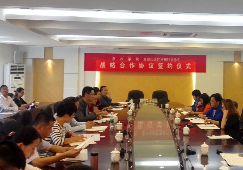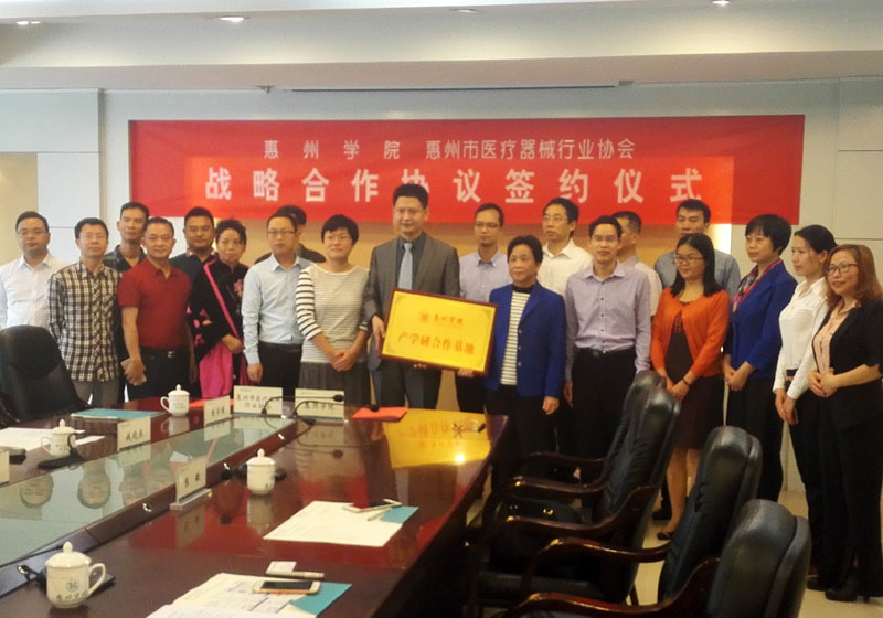 4月26日上午,为了搭建社会需求和学校人才培养及产学研的平台,惠州学院、惠州市医疗器械行业协会在惠州学院行政楼202会议室举行战略合作签约仪式。惠州学院副校长赖美琴、惠州市医疗器械行业协会会长菅冀祁代表双方共同签订战略合作协议,并进行产学研合作基地授牌仪式。