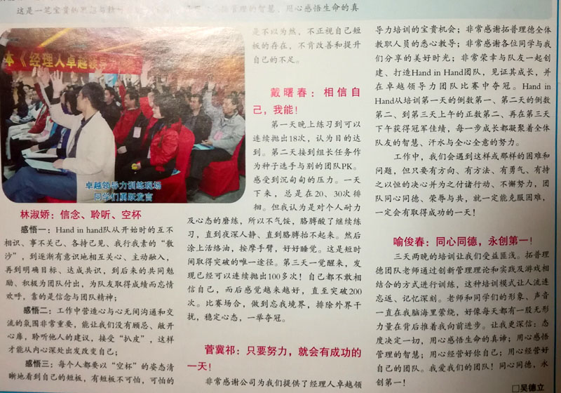 七年前的2010年12月25日至27日,来自惠州市华阳多媒体有限公司各部门及华阳集团医疗电子事业部/惠州市华阳医疗电子有限公司(筹)的小伙伴们在拓普理德《经理人卓越领导力》培训中相聚、相识、相知。在由内而外的领导力修炼中、在残酷的分组PK中,菅冀祁博士作为队长与小伙伴们携手创建、打造了Hand in Hand团队,共同见证其从一团散沙逐步捏合为卓越团队的艰苦历程。从培训第一天的倒数第一、第二天的倒数第二、到第三天上午的正数第二、再到第三天下午的正数第一,Hand in Hand一步步成长并最终奋勇夺冠。小小的成绩凝聚着全体队员的智慧、汗水与全心全意的努力。惠州华励医疗有限公司与有荣焉。