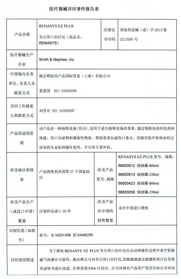 3月25日国家药监局收到施乐辉医用产品国际贸易(上海)有限公司报告,该公司代理的负压伤口治疗仪(注册号:国食药监械(进)字2013第2213595号)由于在启动和操作过程中真空管路存在漏气的可能性,其生产商美国 Smith&Nephew, Inc.公司对该产品进行主动召回。该公司称本次召回产品未在中国销售。请各省、自治区、直辖市食品药品监督管理局加强对此类产品的监督管理。