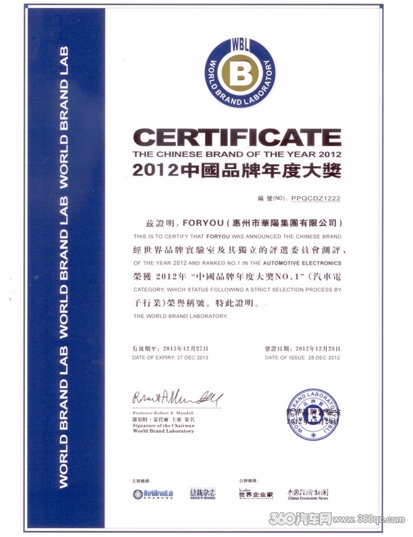 近日,全球三大品牌价值评估机构之一的世界品牌实验室,于香港发布了2012年第九届【中国品牌年度大奖NO.1】暨汽车电子行业最具影响力品牌TOP10,华阳FORYOU品牌再度成功入选。同时当选的还有中国国际航空、中国移动、中国工商银行、三星、华为等50个活跃在本年度中国经济舞台的领军品牌。