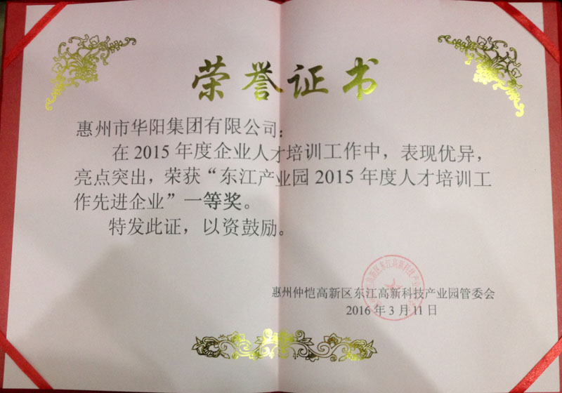 为鼓励、引导园区企业发挥主体作用、加强人才培训工作,3月11日惠州市东江产业园召开企业人才工作会议,对2015年度人才培养工作成绩突出的15家企业进行表彰奖励。惠州市华阳集团股份有限公司、惠州华励医疗有限公司双双获奖。