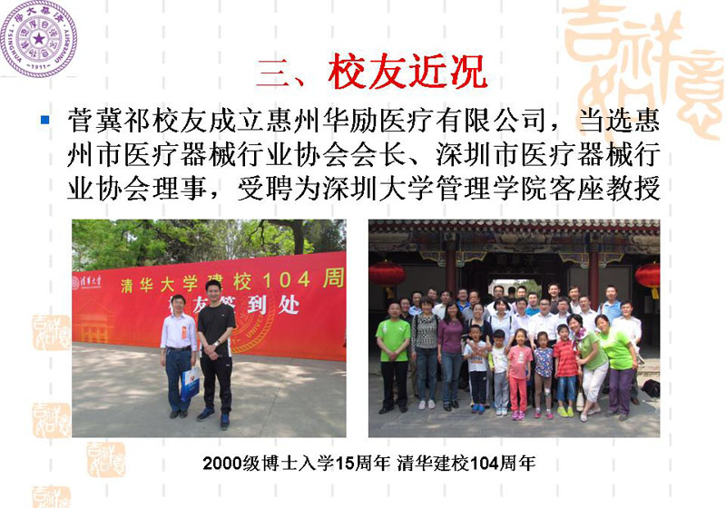 聚会中,作为清华惠州校友年度喜事,张元泽会长向各位校友介绍了惠州华励医疗有限公司最新进展以及菅冀祁博士受聘深圳大学客座教授等消息。清华惠州校友会会长张元泽,常务副会长、伟乐科技董事长邹伟华,副会长、惠州华阳集团副总裁吴卫,副会长、广东华阳通信工程有限公司董事长王旭亮,秘书长、惠州科锐半导体照明有限公司总经理张人天,副秘书长、惠州市华阳光学技术有限公司总经理李光辉等校友会领导,详细了解了惠州华励医疗有限公司近期进展,对华阳医电、华励医疗成绩给以充分肯定及全力支持,并对未来发展提出了非常好的建议。校友们的亲切关怀让菅冀祁及华励医疗同事们感受到了家的温暖。感谢!感恩!