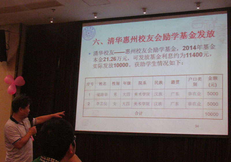 本次聚会,除清华惠州校友会上年度工作情况之外,还介绍了校友会财务收支、校友会工作计划。本年度,清华校友会励学基金对清华大学美术学院两位贫困学生梁路非、李芷仪进行了资助,这两位学生均来自惠州市博罗县。