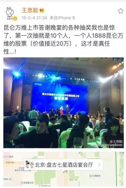 王思聪曾吐槽昆仑万维“上市答谢晚宴的各种抽奖我也是惊了,第一次抽就是10个人,一个人1888昆仑万维的股票(价值接近20万),这才是真任性…!”从前期创业,到2008年昆仑万维正式成立,再到2015年创业板上市,昆仑万维成功的背后,多少泪水、多少汗水、多少困境中咬紧牙关的坚韧、多少天翻地覆慨而慷的豪迈……