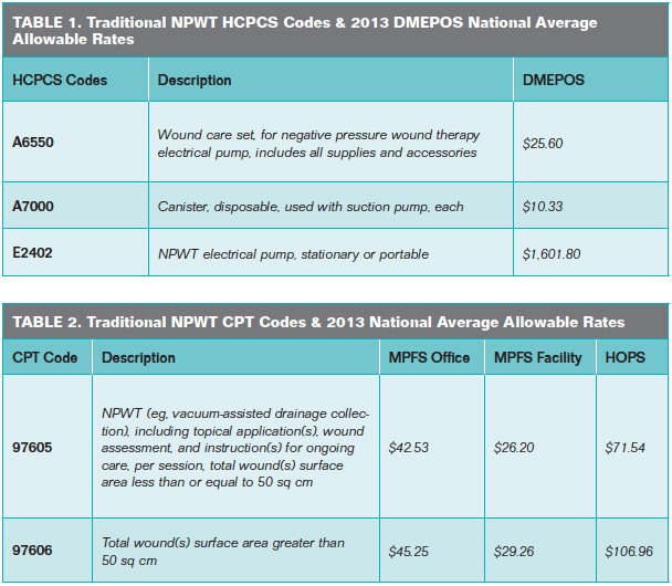 TodaysWoundClinic.com: Similar to surgical dressings, there was first just one negative pressure wound therapy (NPWT) pump. The manufacturer of that device had the difficult job of introducing NPWT to Medicare; obtaining HCPCS codes for the product, canister, and dressings; obtaining a reasonable DMEPOS Fee Schedule allowable payment rate; obtaining a CPT code to account for the QHPs work of applying the device; working with the DME MACs to write the first LCD for NPWT; and working with the MACs to include positive coverage for the application of NPWT in their LCDs. See Table 1 for a list of HCPCS codes created for traditional NPWT pumps/supplies/dressings and the 2013 national average DMEPOS Fee Schedule rates for those codes. These codes and allowable rates apply when a patient obtains the equipment from a DMEPOS provider/supplier and uses the equipment in his/her home. If a home health agency (HHA) is providing care to the patient in the home, the HHA is not required to supply the traditional NPWT pump/supplies/dressings. The Medicare Part B-covered patient should acquire the NPWT equipment/supplies/dressings from a DMEPOS provider/supplier.