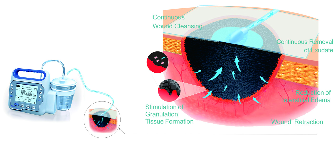 There are five main mechanisms by which the application of negative pressure to a wound may aid in the healing process: Wound retraction Stimulation of granulation tissue formation Continuous removal of exudate Continuous wound cleansing Reduction of interstitial edema